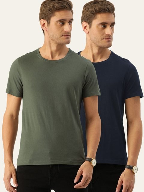 Olive green and Navy Blue solid T-shirt, has a round neck, and short sleeves